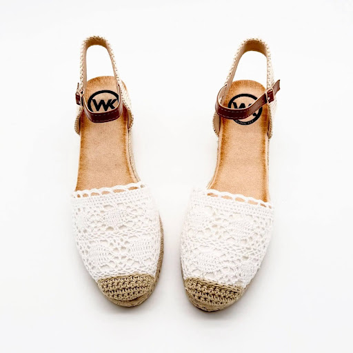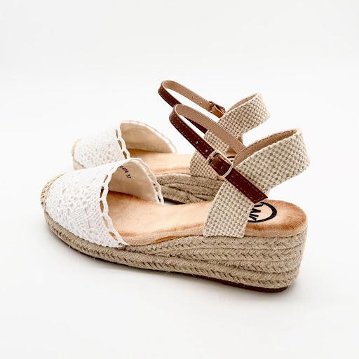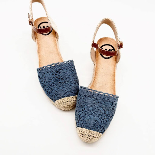 Cuña para mujer con acabado de esparto, tejido crochet y planta de gel antideslizante. Un diseño cómodo, fresco y elegante disponible en blanco y azul.
